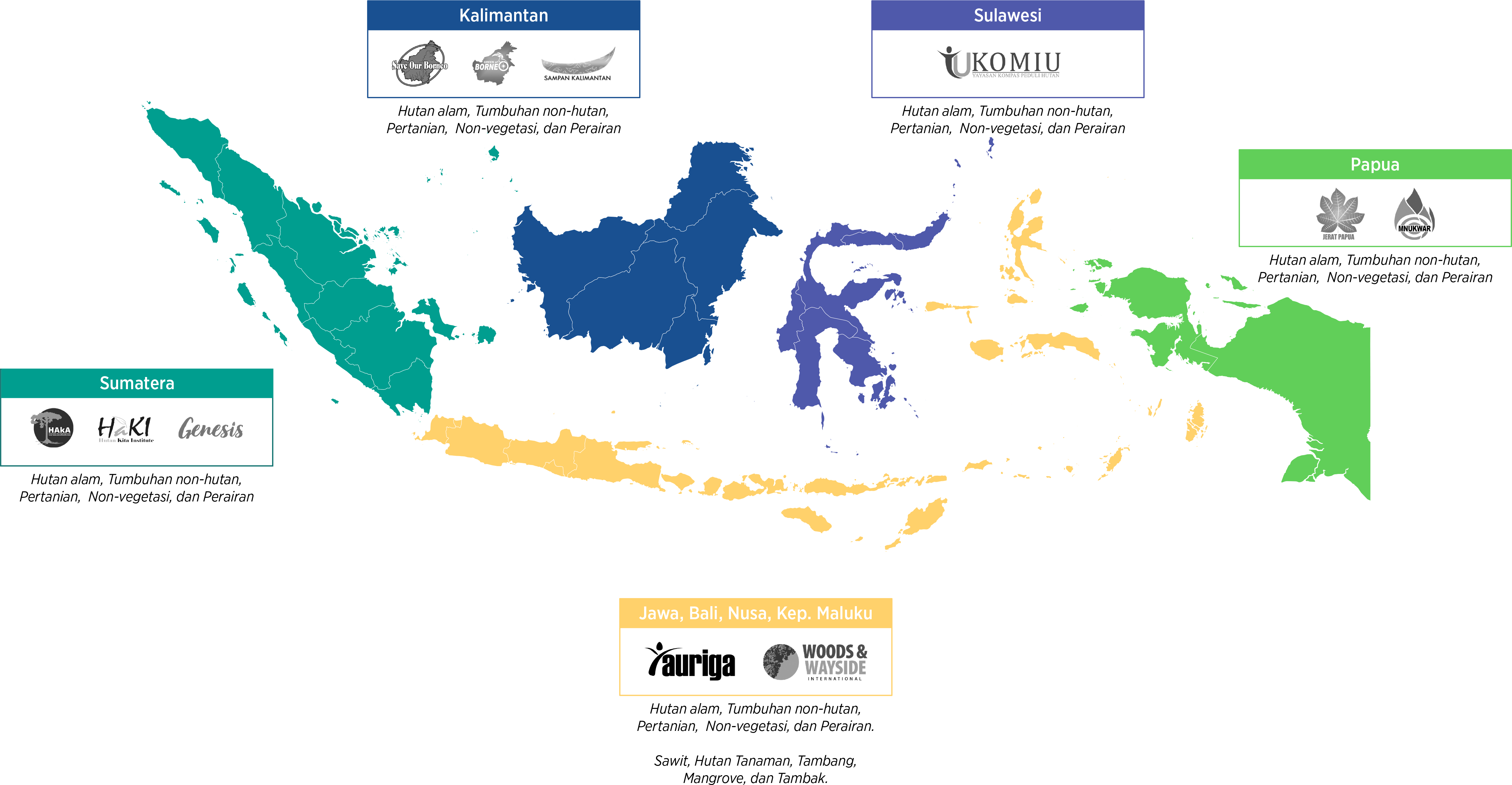Jejaring MapBiomas Indonesia terdiri atas HAKA Aceh, HAKI Sumatera Selatan dan GENESIS Bengkulu dari Sumatera; SAMPAN Kalimantan Barat, Save Our Borneo (SOB) Kalimantan Tengah, Green of Borneo (GOB) Kalimantan Utara dari Kalimantan; KOMIU Sulawesi Tengah dari Sulawesi; MNUKWAR Papua dan JERAT Papua dari Tanah Papua, serta Auriga Nusantara dan Woods & Wayside International. Berikut adalah sebaran jejaring tersebut: